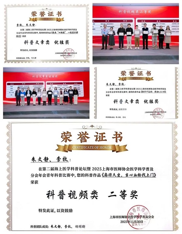 在上海市医师协会及上海市医师协会医学科学普及分会共同举办的第二届海上医学科普论坛暨2025年会上再传喜讯。李牧、朱文静各有两部作品均荣获科普文章类优胜奖,并共同斩获科普视频类二等奖。