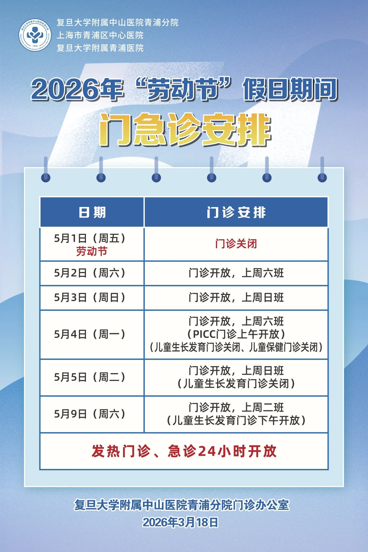 复旦大学附属中山医院青浦分院2026年“劳动节”假日期间门急诊安排